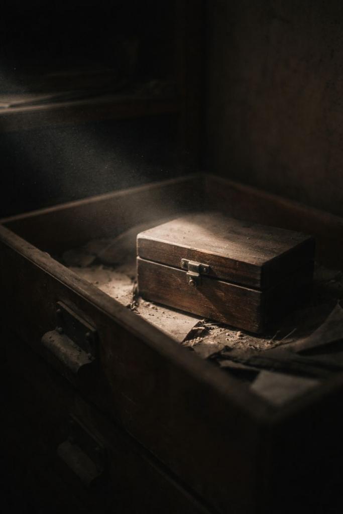Ein Koffer im Dunkeln, ein Lichtstrahl fällt darauf